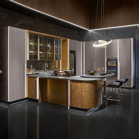 OPPEIN altın rengi işık lüks U şekli modüler mutfak dolapları